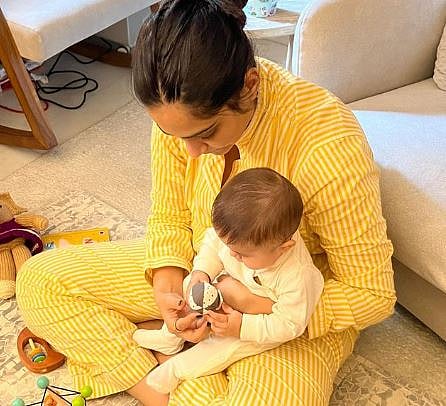 सोनम कपूरने ( Sonam Kapoor ) नुकतेच तिच्या इन्स्टाग्रामवर स्वत: आणि 'वायु' (Vayu) सोबतचा व्हिडिओ शेअर केला आहे. या व्हिडिओतील एका फोटोत सोनम येलो कलरच्या लायनिंग आउटफिटमध्ये असून तिच्या माडीवर वायु बसलेला दिसतोय. तर सोनम वायूला छोटा बॉल देऊन त्याला खेळवण्यात गुंतलेली दिसतेय. यातील दुसऱ्या व्हिडिओत वायू व्हाईट कलरच्या कुर्ता पायजामामध्ये जमिनीवर उलटा झोपलेला दिसत आहे. तर वायुच्या आजूबाजूला खुपसारी खेळणी दिसतात.