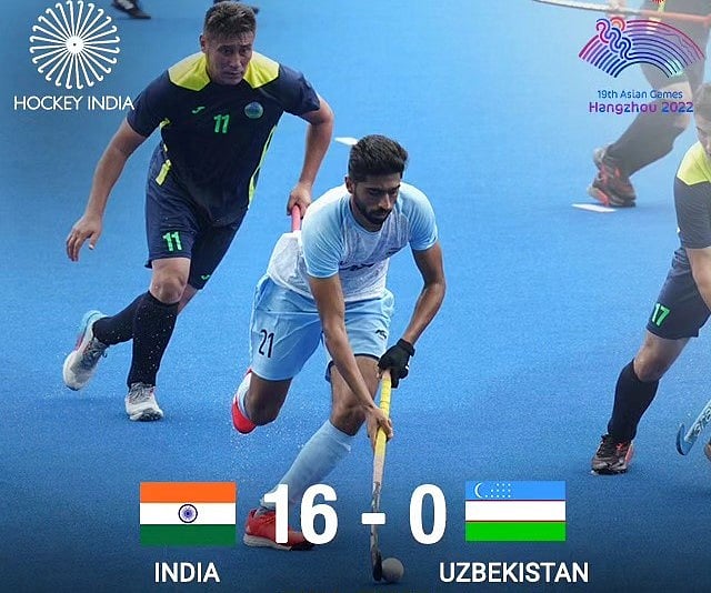 पुढारी ऑनलाईन डेस्क : Asian Games 2023 : चीनमधील हांगझोऊ येथे सुरू असलेल्या आशियाई क्रीडा स्पर्धेत भारतीय पुरुष हॉकी संघाने धमाकेदार सुरुवात केली आहे. ग्रुप ए च्या सामन्यात आज भारतीय संघाने उझबेकिस्तानला सळो की पळो करून सोडले आणि 16-0 ने सर्वात मोठा विजय मिळवला.