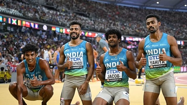 पुढारी ऑनलाईन डेस्क : Asian Games 2023 : भारतीय पुरुष संघाने 400 मीटर रिले शर्यतीत सुवर्णपदक पटकावले आहे. भारतीय संघाने 3 मिनिटे 01.58 सेकंदांमध्ये शर्यत पूर्ण करून सुवर्णपदकावर कब्जा केला. मुहम्मद अनस, अमोज जेकब, मुहम्मद अजमल आणि राजेश रमेश या जोडीने ही सुवर्ण धाव यशस्वी पणे पार पाडली.