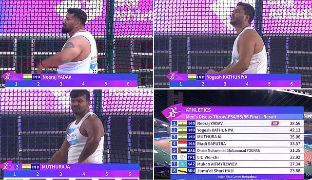 पुढारी ऑनलाईन डेस्क : चीनमधील हांगझो येथे सुरू असलेल्या चौथ्या आशियाई पॅरा गेम्स स्पर्धेत भारताची पदकांची लयलूट सुरुच आहे. आज (दि.२४) पुरुषांच्या पुरुषांच्या थाळीफेक ( डिस्कस थ्रो) नीरज यादवने 38.56 मीटर थ्रोसह सुवर्ण, योगेश कथुनियाने 42.13 मीटरसह रौप्य तर मुथुराजाने 35.06 मीटरसह कांस्य पदक पटकावले.