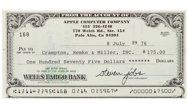 तो चेक ६X३ इंचाचा आहे, ज्यामध्ये स्टीव्ह जॉब्सचे नाव लिहिले आहे. हा चेक २३ जुलै १९७६ चा आहे. हा धनादेश रेडिओ शॅक (Radio Shack) ला देण्यात आला. या चेकमधील अॅपलचा पहिला अधिकृत पत्ता '770 Welch Rd., Ste. 154, Palo Alto' आहे. या चेकवर स्वाक्षरी होण्याच्या काही दिवस आधी अॅपल (Apple Computer Company)ची स्थापना झाली.