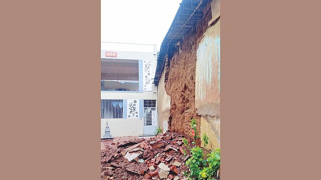 बेळगाव : शहरात मुसळधार पाऊस होत असल्यामुळे आचार्य गल्ली शहापूरमध्ये पद्मावती नरहरी गलगली यांच्या घराच्या भिंतीचा काही भाग कोसळला. घराच्या मातीच्या भिंतीवर सतत पाणी पडत राहिल्याने काही भाग कोसळला.