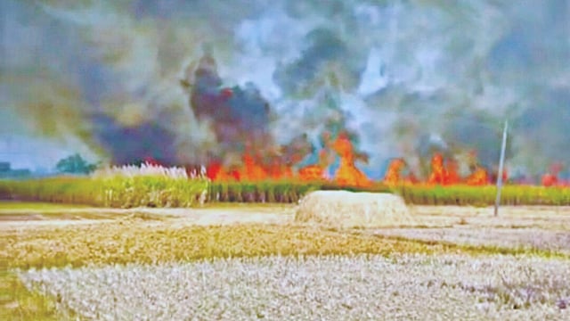 मुबलक पाण्याची सोय असल्याने जळगे येथील नदी काठावरील शिवारात मोठ्या प्रमाणात ऊस उत्पादन घेतले जाते. तोडणीसाठी टोळ्या न मिळाल्याने एकाही शेतकऱ्याचा ऊस कारखान्याला गेलेला नाही. भागातील शेती पंपांना विद्युत पुरवठा करणाऱ्या ट्रान्सफॉर्मरजवळ खाली आलेल्या वीज वाहिनीला शॉर्टसर्किट झाल्याने अचानक ठिणगी पडली. त्यातून सुकलेल्या उसाला आग लागली. काही क्षणातच आग सर्वत्र पसरली. जोरदार वाऱ्यामुळे आगीने रौद्र रूप धारण केले. काही वेळातच आजूबाजूच्या शेतकऱ्यांचे ऊस पीक आगीच्या भक्ष्यस्थानी पडले.