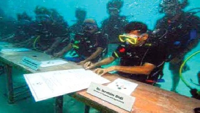 या बैठकीसाठी खोल पाण्यात टेबल मांडण्यात आले आणि राष्ट्रपतींसह सर्व मंत्र्यांच्या आसपास मासे विहार करत असताना दिसून आले. या सर्वांनी हातवार्याच्या माध्यमातून संवाद साधला आणि वॉटरप्रूफ बोर्डवर खास शाईने सही देखील केली. एखाद्या देशातील कॅबिनेट बैठक समुद्राखाली होण्याची ती जागतिक स्तरावरील पहिलीच वेळ होती.