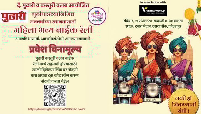 कोल्हापूर : पुढारी वृत्तसेवा : महिला सक्षमीकरणाचा संदेश देणाऱ्या आणि महिलांच्या शक्तीचा जागर करण्यासाठी दै. 'पुढारी', 'टोमॅटो एफएम' ९४.३' आणि 'पुढारी कस्तुरी क्लब'च्या वतीने महिलांच्या भव्य बाईक रॅलीचे आयोजन करण्यात आले आहे. खास गुढीपाडव्यानिमित्त आणि मराठी नववर्षानिमित्त वीणा वर्ल्ड प्रस्तुत ही भव्य बाईक रॅली रविवारी (दि. ७) सकाळी ७.३० वाजता कोल्हापुरातील दसरा चौक येथून निघणार आहे.