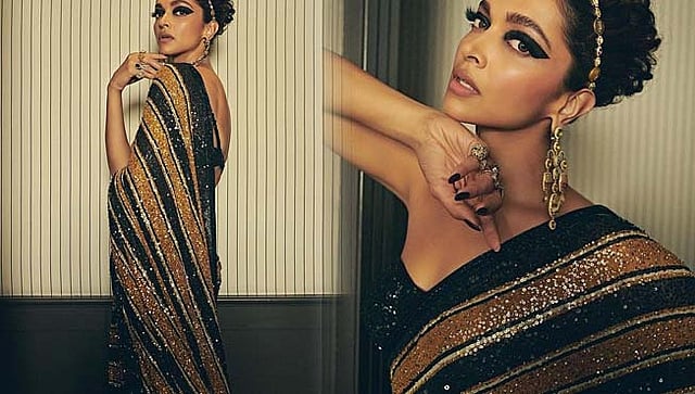 कान्सच्या रेड कार्पेटवर प्रसिध्द फॅशन डिझायनर सब्यासाचीची ब्लॅक ॲण्ड गोल्ड सीक्वेन साडी घालून दीपिकाने आपल्या अदा दाखवल्या आहेत. या अभिनेत्रीने साडी लूक एक्स्ट्रा स्पेशल करण्यासाठी ड्रामेटिक टच दिलं. दीपिकाने फंकी हेयरबन आणि गोल्डन हेडबँडसोबत हायलाईट केलं. ड्रामेटिक आयलायनर, न्यूड लिप्स, chandelier ईअरिंग्स, रिंग्ससोबत आपला लूक पूर्ण केला आहे.