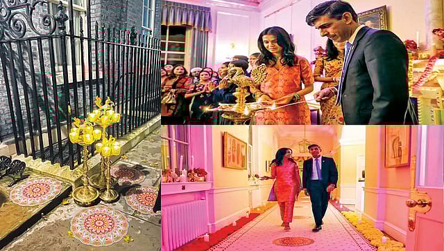 अक्षता या भारतीय पेहरावामध्ये होत्या, तर ऋषी यांनी ब्लेझर आणि फॉर्मल कपडे परिधान केले होते. 'सायंकाळी पंतप्रधान ऋ षी सुनाक यांनी हिंदू धर्मातील पाहुण्यांचं डाऊनिंग स्ट्रीटच्या निवासस्थानी दिवाळीनिमित्त स्वागत केलं. अंधःकारावर मात करून तेजोयम दिव्यांची आरास करण्याचा हा सण आहे,' असे पंतप्रधान सुनक यांच्या अधिकृत हॅण्डलवरून पोस्ट करण्यात आले आहे. '10 डाऊनिंग स्ट्रीट' येथील घराबाहेर समया प्रज्वलित करण्यात आल्या होत्या. तसेच प्रवेशद्वारावर रांगोळीचाही थाट घातला होता.