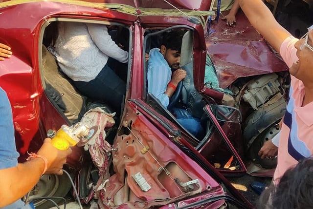 पुणे : पुणे – सोलापूर राष्ट्रीय महामार्गावर कदमवाकवस्ती (ता. हवेली) ग्रामपंचायत हद्दीत एच. पी गेट नंबर ३ च्या समोर ट्रक व चारचाकी गाडी यांच्यात भीषण अपघात झाला आहे. हा अपघात २४ डिसेंबरला सकाळी दहा वाजण्याच्या सुमारास झाला आहे. या अपघातात चारचाकी गाडीने पाठीमागून मालवाहू ट्रकला जोरदार धडक दिल्याने गाडीतील चौघे अडकले असून लोणी काळभोर पोलिसांसह ग्रामस्थ कटरच्या सहाय्याने बाहेर काढण्याचे शर्तीचे प्रयत्न करीत आहेत. अपघातात जखमी झालेल्या व्यक्तीची नावे समजू शकली नाहीत.