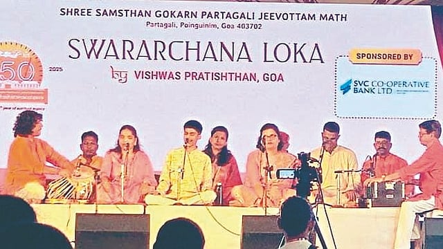 फोंडा : श्री गोकर्ण पर्तगाळ मठाच्या 550 व्या वर्धापनदिन सोहळ्यात बुधवारी ढवळी फोंडा येथील लोकविश्वास प्रतिष्ठानच्या दृष्टिबाधित विद्यार्थ्यांनी ‘स्वर अर्चना‘ हा सांघिक कार्यक्रम सादर करून सगळ्या प्रेक्षागृहाला भारावून टाकले. या कार्यक्रमाला परमपूज्य श्रीमद् विद्याधिशतीर्थ स्वामीजींनी उपस्थित राहून दिव्यांग मुलांच्या गायनाचे श्रवण केले आणि त्यांचे कौतुक केले. या कार्यक्रमाबद्दल समाधान व्यक्त करून पुन्हा एकदा अशा पद्धतीचे व्यासपीठ पर्तगाळ मठाच्या माध्यमातून या मुलांना देण्याचा विचारही स्वामींनी व्यक्त केला.