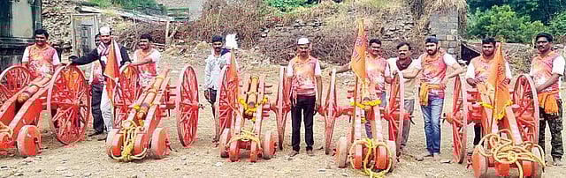 दसर्याला पहाटे पाच वाजता पाच तोफांचे पाच आवाज काढले जातात. पाच तोफा सोनोरी येथील पानसे सरदाराने श्रीमयूरेश्वरास दिल्या आहेत. या तोफांचे मानकरी वाघू अण्णा वाघ, भिकाजी गणेश वाघ, सदाशिव बाळकृष्ण वाघ आहेत. या तोफांच्या दारुगोळ्याचे काम भारत सासवडे, हेरंभ सासवडे, स्वानंद सासवडे (कासार) यांची मुले परंपरेनुसार पाहत आहेत. दारुगोळा भरणारी मंडळी नाईक(जाधव, चव्हाण), जगताप, तावरे, सणस, पवार, माडकर आहेत.