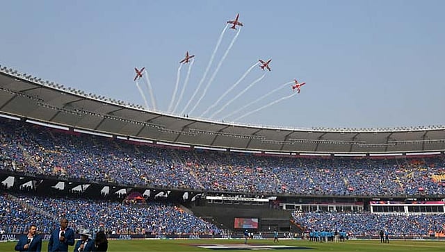 पुढारी ऑनलाईन : भारत आणि ऑस्ट्रेलिया यांच्यात आज रविवारी (दि. १९ नॉव्हेंबर) विश्वचषक क्रिकेट स्पर्धेचा अंतिम महासंग्राम होत आहे. अहमदाबादच्या नरेंद्र मोदी स्टेडियमवर हा हायव्होल्टेज ड्रामा होत आहे. अंतिम सामन्यात ऑस्ट्रेलियाने टॉस जिंकून प्रथम क्षेत्ररक्षणाचा निर्णय घेतला आहे. दरम्यान, या अंतिम सामन्यापूर्वी एका खास एअर शोने सर्वांचे लक्ष वेधले. अंतिम सामन्याचा थरार सुरू होण्यापूर्वी भारतीय वायुसेनेच्या 'सूर्य किरण एरोबटिक टीम'ने (Surya Kiran aerobatic team) 'एअर शो' सादर केला. या चित्तथरारक हवाई चित्तथरारक कवायतीचा थरार प्रेक्षकांनी अनुभवला. (IND VS AUS Final World Cup 2023)