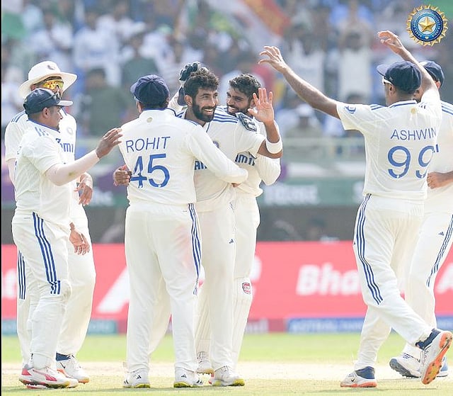 इंग्लंडला 275 धावांवर आठवा धक्का बसला. बुमराहने त्याच्याच चेंडूवर बेन फॉक्सचा झेल घेतला. फॉक्सने 69 चेंडूत 36 धावांची खेळी खेळली. 281 धावांवर बशीरला मुकेशने यष्टिरक्षक भरतच्या हाती झेलबाद केले. त्याला खातेही उघडता आले नाही. अखेर बुमराहने ३६ धावांवर खेळणार्या टॉम हार्टले याला क्लीन बाेल्ड करत इंग्लंडचा दुसरा डाव संपुष्टात आणला.
