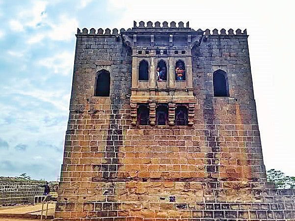 कुलापकर दरवाजा ओलांडल्यानंतर शिवकुंजाकडे जाणार्या सपाट रस्त्याच्या डाव्या बाजूला किल्ल्याच्या उत्तरेस खोल दरी आहे, तर उजव्या बाजूच्या कपारीमध्ये पाणपोढ्या खोदल्या आहेत. डोंगरउतारावर सपाटी आणि डोंगराचा चढ यांचा कोन साधून पाणपोढ्यांची खोदाई केली आहे. या दोन्ही पाणपोढ्या महत्त्वाच्या असून, किल्ल्यावरील पिण्याचे पाणी पुरवण्याचे एकमेव साधन आहे. किल्ल्यावरील इमारतींमध्ये अंबरखाना, शिवकुंज, कमानीची मशीद, सरकारवाड्याचे अवशेष, पोखरणी, बदामी तलाव, कडेलोट व घुमट असून, त्यांचे विशेष महत्त्व आहे.