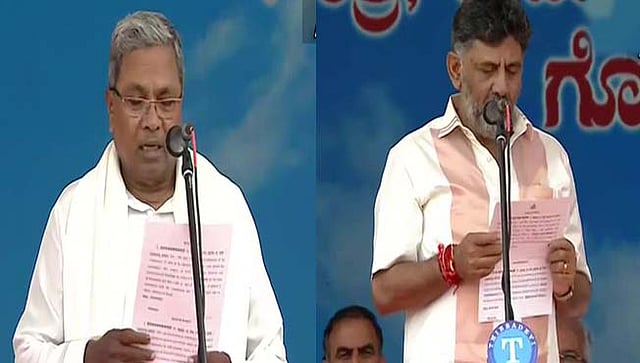 बंगळूर : पुढारी वृत्तसेवा; देशातील प्रमुख राष्ट्रीय नेत्यांच्या मांदियाळीत शनिवारी दुपारी १२.३० वाजता बंगळूर येथील कंठिरवा स्टेडियमवर (kanteerava stadium) कर्नाटकाचे ३२ वे मुख्यमंत्री म्हणून सिद्धरामय्या (Siddaramaiah) आणि उपमुख्यमंत्री म्हणून डी. के. शिवकुमार (DK Shivakumar) यांनी शपथ घेतली. राज्यपाल थावरचंद गेहलोत यांनी त्यांना पद आणि गोपनीयतेची शपथ दिली. (Karnataka CM oath taking ceremony) सिद्धरामय्या दुसऱ्यांदा कर्नाटकच्या मुख्यमंत्रीपदी विराजमान झाले आहेत. सिद्धरामय्या आणि डी. के. शिवकुमार यांच्या सोबत ८ आमदारांना मंत्रिपदाची शपथ देण्यात आली आहे.