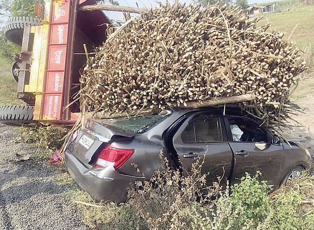कारवर उस पडल्यामुळे कारमधील तीनजण दबले गेले. या अपघातामुळे परिसरात असणार्या शेतकर्यांनी धाव घेतली. उस बाजूला सारण्यासाठी वेळीच मदत केली. या प्रसांगवधानामुळे अनर्थ टळला. या अपघातात तीन जण किरकोळ जखमी झाले असून, कारचे मोठे नुकसान झाले आहे. उस वाहतुकीसाठी हल्ली डब्बल ट्रॉली ट्रॅक्टरचा उपयोग साखर कारखाने करून घेत असून, या ट्रॅक्टरवरील चालकही अल्पवयिन आहेत. मोठ्या आवाजात गाणे लावून ट्रॅक्टर चालविले जातात मागून येणारी वाहने समजत नसल्याने अपघाताची घटना होते. अशा अपघातांची संख्याही वाढ होण्याची शक्यता नाकारता येत नाही. या अपघात प्रकरणी नेवासा पोल्लिसांकडे चौकशी केली असता माहिती घेवून सांगतो, असे उत्तर मिळाल्याने नेवासा पोलिसांचे पुन्हा वराती मागून घोडे दामटण्याचा प्रत्यय आला आहे