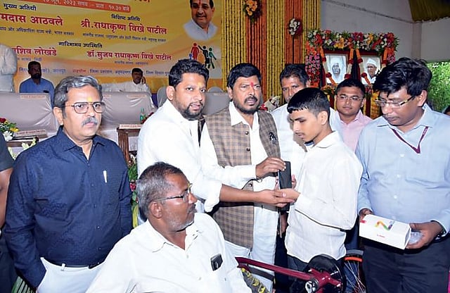 केंद्रीय अधिकारीता मंत्रालय व सामाजिक न्याय विभागाच्या माध्यमातून खा. डॉ. सुजय विखे पा. यांच्या माध्यमातून 1 हजारांहून अधिक दिव्यांग व्यक्तिंना मंजुर झालेल्या साधन साहित्याचे मोफत वितरण मंत्री आठवले यांच्या उपस्थितीत करण्यात आले. यावेळी खा. डॉ. सुजय विखे पा., खा. सदाशिव लोखंडे, जिल्हाधिकारी सिध्दराम सालीमठ, जि. प. मुख्य कार्यकारी अधिकारी आशिष येरेकर, जिल्हा समाज कल्याण अधिकारी राधाकिसन देवडे, डॉ. अभिजित दिवटे, विजयराव वाकचौरे, बाळासाहेब गायकवाड, श्रीकांत भालेराव, सुरेंद्र थोरात, प्रकाश लोंढे, पप्पू बनसोडे, आशिष शेळके, भिमा बागुल, चांगदेव जगताप, चद्रकांत सरोदे, राजेंद्र गवांदे उपस्थित होते.
