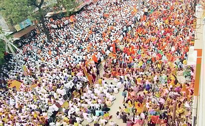 मोर्चाचे एक टोक छत्रपती शिवाजी महाराज स्मारकापासून गांधी चौक, गांधीनगर, श्रीराम मंदिर रोडपर्यंत दुसरे टोक होते. तहसील कार्यालयासमोरून धारणगाव रोड येथे डॉ. आंबेडकर पुतळ्याला वळसा घालून मुख्य रस्त्यावर स्मारकाजवळ मोर्चाचे भव्य सभेत रूपांतर झाले. मोर्चेकरांच्या हातात विविध फलक, भगवे ध्वज, डोक्यात भगव्या टोप्या, महिलांनी परिधान केलेल्या भगव्या साड्यांमुळे सर्व परिसर भगवामय झाला होता.