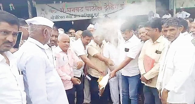 अहमदनगर; पुढारी वृत्तसेवा : केंद्र शासनाने कांदा निर्यात शुल्क थेट 40 टक्के केल्याने या निर्णायाच्या विरोधात जिल्ह्यामध्ये पडसाद उमटू लागले आहे. केंद्र शासनाच्या कांदा निर्यात शुल्कवाढीच्या निर्णयाच्या प्रतिकात्मक आदेशाची स्वाभिमानी शेतकरी संघटनेच्या कार्यकर्त्यांनी होळी केली. कांद्याचे निर्यात शुल्क रद्द करण्याच्या मागणीसाठी स्वाभिमानी शेतकरी संघटनेच्या कार्यकर्त्यांनी सोमवारी शेवगाव बाजार समितीच्या कांदा मार्केटमध्ये केंद्र सरकारच्या जाचक निर्णयाच्या प्रतिकात्मक आदेशाची होळी केली. यावेळी कांद्याचे लिलाव बेमुदत बंद करण्याच्या मागणीचे निवेदन खरेदीदारांना दिले.