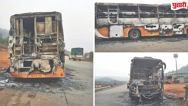 देवरुख : संगमेश्वर तालुक्यातील साखरपा जाधववाडी परिसरात गद्रे पेट्रोल पंपासमोर शुक्रवारी पहाटेच्या सुमारास खासगी बसला अचानक आग लागून गाडी पूर्णतः जळून खाक झाली. मात्र चालकाच्या प्रसंगावधानामुळे बसमधील सर्व 30 प्रवासी सुखरूप बचावले आहेत.