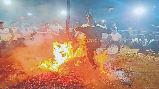 फाल्गुन पंचमीपासून सुरू झालेल्या या उत्सवात चतु:सीमेतील कोंडकारूळ, बोऱ्या, बुधल, पालशेत व नागझरी या गावांत देवीच्या खेळ्यांची भोवनी पार पडली. त्यानंतर भाटी मैदानावर रात्री आयोजित धार्मिक कार्यक्रमात संकासुराने पेटत्या होमाभोवती प्रदक्षिणा घालत भक्तांचा पाठलाग करण्याची पारंपरिक प्रथा सादर केली. होमाला अग्नी दिल्यानंतर संकासुराने ज्वलंत निखाऱ्यांतून धावत उपस्थितांमध्ये थरार निर्माण केला. या वेळी ‘जय देवी सुंकाई’च्या घोषणांनी परिसर दुमदुमून गेला. संकासुराला चिडवणाऱ्या भक्तांचा तो पेटत्या होमातून पाठलाग करतो आणि पकडल्यावर भक्त त्याचा नमस्कार करून आशीर्वाद घेतात, अशी आगळीवेगळी परंपरा पाहण्यासाठी जिल्हा व परजिल्ह्यातून मोठी गर्दी उसळली होती.