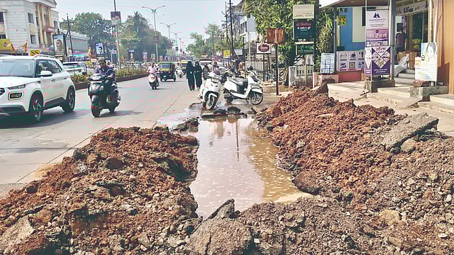 कोट्यवधी रुपये खर्च करून रत्नागिरी शहरासाठी नवीन नळपाणी योजना राबवण्यात आली. मात्र या योजनेची मुख्य वाहिनीला वारंवार गळती लागत आहे. अनेकदा दुरुस्त करुनही या वाहिनीचा गळती लागण्याचा प्रश्न सुटलेला नाही. शहरातील मारुती मंदिर परिसरात साक्षी फुड व महालक्ष्मी मार्टच्या समोर दोन ठिकाणी गेल्या काही दिवसांपासून पाण्याचा मोठ्याप्रमाणात जमिनी खालून निचरा होत होता. रस्त्याच्या उंचीपासून खालील बाजूला असणाऱ्या दुकानदारांच्या दुकानांजवळ हे पाणी निचरत होते. त्यामुळे हा प्रकार उघड झाला. सोमवारी दोन ठिकाणी जेसीबीच्या सहाय्याने खणण्यात आल्यानंतर हा प्रकार निदर्शनास आला. त्यानंतर पाईपलाईनच्या दिशेने चर खणण्यात आला. सकाळपासून सायंकाळी उशिरापर्यंत पाईपची गळती काढण्याचे काम कर्मचाऱ्यांकडून सुरू होते. याच दरम्यान, मोठ्याप्रमाणात पाणी वाया जात असल्याचेही लक्षात आले. सायंकाळीपर्यत दोन्ही ठिकाणी गळती काढली जाईल असे नगर पालिकेतर्फे सांगण्यात आले. काही दिवसांपूर्वी गोगटे जोगळेकर महाविद्यालयासमोर पाईप फुटून मोठ्याप्रमाणात पाणी वाया गेले होते. त्यामुळे राजिवडा व खडपेवठार येथे पाण्याचा प्रश्न निर्माण झाला होता.