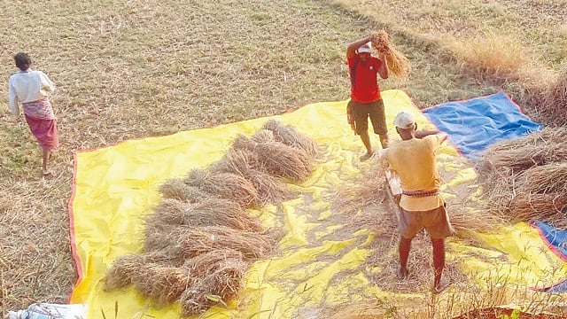 आडेली : ‘ह्यो पावस... कधी आंधारान येयत सांगाक येवचो नाय.. तेवा...खळाबिळा करुच्या भानगडीत पडाया नको सरळ ताडपत्री पसरवन... बाकडो ठेवन...भात झोडुक घेवया. पावस इलोच तर त्याच ताडपत्रेन भात झाकुक गावताला... ’ असे संभाषण सध्या सर्वत्र शेतकरी वर्गातून ऐकू येत आहे. परतीच्या पावसाने शेतातील पीक ओलेच असल्याने शेतखळे न करता ताडपत्री व प्लास्टिक कापडाचा आधार घेत शेतातच भाताची झोडणी करताना शेतकरी दिसत आहे. तर काळाच्या ओघात विविध यांत्रिकीकरणामुळे ‘शेतखळे’च कालबाह्य झाल्याचे दिसून येत आहे.