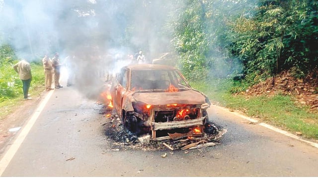 दोडामार्ग : तिलारी येथे एका कारला आग लागल्याची घटना गुरुवारी दुपारी घडली. या कारमधून मांस तस्करी होत असल्याच्या संशयावरून कारला आग लावल्याची चर्चा होती. याप्रकरणी पोलिसांनी दोडामार्गचे नगराध्यक्ष चेतन चव्हाण यांना चौकशीसाठी ताब्यात घेतले आहे. घटनेचे गांभीर्य लक्षात घेता कोकण परिक्षेत्राचे महानिरीक्षक संजय दराडे यांनी पोलिस ठाण्याला भेट देत घटनेची माहिती घेतली. यामुळे दोडामार्ग शहरासह संपूर्ण तालुक्याला पोलिस छावणीचे स्वरूप प्राप्त झाले. रात्री उशिरापर्यंत गुन्हे दाखल करण्याची प्रक्रिया सुरू होती.