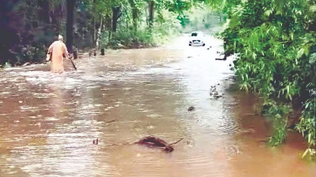 अतिवृष्टीमुळे वीजघर-राणेवाडी येथे रस्त्यावर पाणी आले. या रस्त्याला नदीचे स्वरूप प्राप्त झाले. रस्त्यावर गुडघाभर पाणी आल्याने वाहन चालकांची चांगलीच पंचाईत झाली. परिणामी, वाहतूक ठप्प झाली.