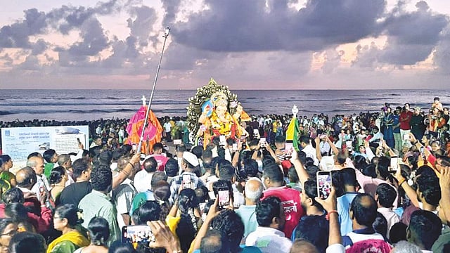 आचरा : गणपती बाप्पाच्या विसर्जनच्या वाटेवरठिक ठिकाणी रांगोळ्यांच्या पायघड्या ... सनईचे सुरेल सूर...बैंड पथकाचे सुश्राव्य वादन...ढोल ताशांचा अखंड गजर... भव्य दिव्य रथ....त्यावरील आकर्षक पुष्प सजावट अन गणेशभक्तांचा ओसंडून वाहणारा उत्साह... आचरा समुद्रावर काहीसे भावूक झालेले वातावरण.....! पापण्यांच्या कडांवर ओथंबलेले ते अश्रू.....! आणि बाप्पा घरी जाऊ नये,अशी काहीशी मनामध्ये घर करून राहीलेली भावना.. शनिवारी सायंकाळी विसर्जनाच्या वेळी पाहायला मिळाली.