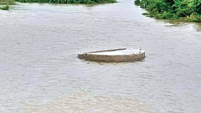 दोडामार्ग-वीजघर राज्य मार्गावरील तिलारी मिनी कॉलनी येथील पुलाजवळ तिलारी नदीपात्रात मागील काही दिवसांपासून एका चौथर्याचे काम सुरू आहे. काम सुरू झाल्यापासून ते एखादे शासकीय काम असेल अशा चर्चा रंगू लागल्या. शिवाय जलसंपदा विभागाकडून नदीतील गाळ काढण्याचेही काम सुरू होते. त्यामुळे गाळ काढत असावेत असा कयासही बांधला गेला. पावसाळा आला अन् या कामाचा वेग वाढला. पावसाळ्यातही काम जोरदार सुरू होते.दरम्यान तालुक्यात रविवारी मुसळधार पर्जन्यवृष्टी झाली. परिणामी तिलारी नदीतील पाणी प्रवाह वाढला. पाण्याच्या जोरदार प्रवाहामुळे नदीपात्रातील चौथर्याचा अर्धा भाग कोसळला.