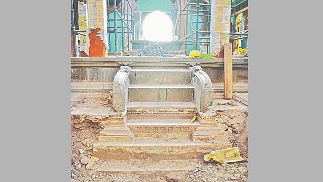 अंबाबाई मंदिराच्या 1,400 कोटींच्या विकास आराखड्याच्या पहिल्या 144 कोटींच्या टप्प्यात मंदिर जतन संवर्धनाची कामे सुरू आहेत. मंदिराच्या आवारात 15 वर्षांपूर्वी बसविण्यात आलेल्या फरशा काढून किमान 9 ते 10 इंच जाडीच्या दगडी फरशा घालण्यात येणार आहेत. गरुड मंडपाच्या पायरीला लागून असलेल्या फरशा काढण्यात आल्या. या फरशा काढताना आणखी तीन पायऱ्या सापडल्या. यामुळे गरुड मंडपातील उर्वरित फरशी काढून तीन फूट खाली उत्खनन करायचे का? यासंदर्भात पुरातत्त्व विभागाकडून मार्गदर्शक सूचना मागवण्यात आल्याची माहिती देवस्थान समितीचे सचिव शिवराज नाईकवाडे यांनी दिली.