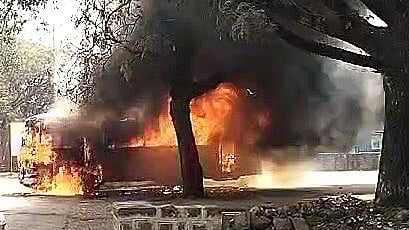 गांधीनगर : केएमटी बस सुरू करताना अचानक शॉर्टसर्किट होऊन आग लागल्याने चिंचवाडवासीयांनी बर्निंग बसचा भीषण थरार अनुभवला. या आगीत बस खाक झाली असून, सुमारे दहा लाख रुपयांचे नुकसान झाले. बसमधील प्रवासी वेळीच उतरल्याने जीवितहानी टळली. ही घटना चिंचवाड (ता. करवीर) येथे ग्रामपंचायत चौकात बुधवारी दुपारी 12.45 वाजण्याच्या सुमारास घडली.