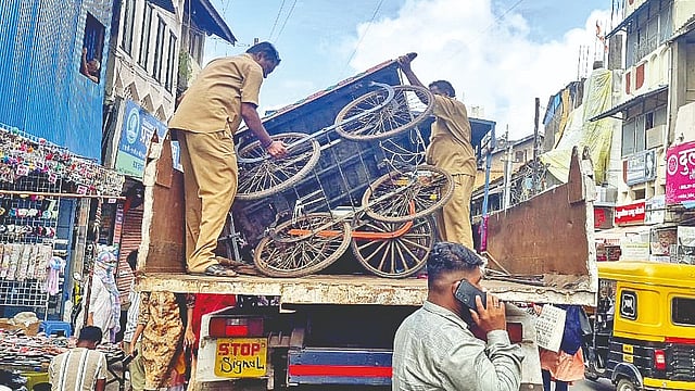 कोल्हापूर : महापालिकेच्या अतिक्रमण निर्मूलन पथकामार्फत गुुरुवारी बिनखांबी गणेश मंदिर, महाद्वार रोड व रंकाळा टॉवर परिसरात कारवाई करण्यात आली. या कारवाईत 4 हातगाड्या, 8 स्टँड बोर्ड व एका केबिनवर कारवाई करून जप्त करण्यात आले.