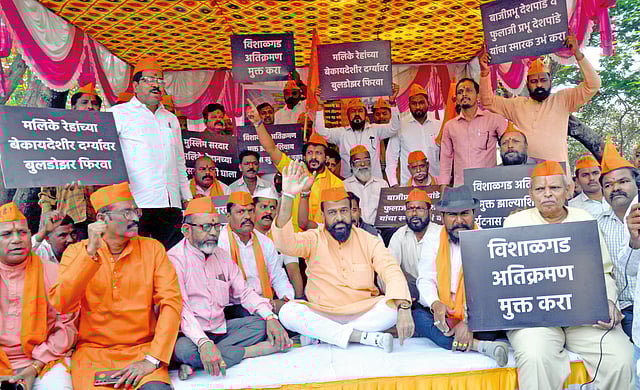 कोल्हापूर : विशाळगड अतिक्रमणमुक्त करावा या मागणीसाठी हिंदुत्ववादी संघटनेच्या वतीने जिल्हाधिकारी कार्यालयासमोर निदर्शने करण्यात आली.  (छाया : पप्पू अत्तार)