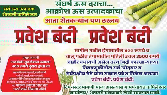 सरवडे, पुढारी वृत्तसेवा : मराठा आरक्षणासाठी उपोषण करणारे उपोषणकर्ते मनोज जरांगे- पाटील यांना पाठिंबा दर्शविण्यासाठी राज्यभर नेत्यांना गावबंदी करण्यात आली. याच धर्तीवर ऊसदर आंदोलनासाठी कपिलेश्वर (ता.राधानगरी) येथील ग्रामस्थांनी आधी उसाचं मिटवायचं आणि मगचं गावात यायचं, असा ठराव केला आहे. गावात डिजिटल बोर्डद्वारे ऐन बिद्रीच्या निवडणुकीच्या तोंडावर उमेदवार व सर्वपक्षीय नेत्यांना गावबंदी करत ऊसदराच्या संघर्षासाठी ऊस उत्पादकांचा आक्रोश दिसून आला.