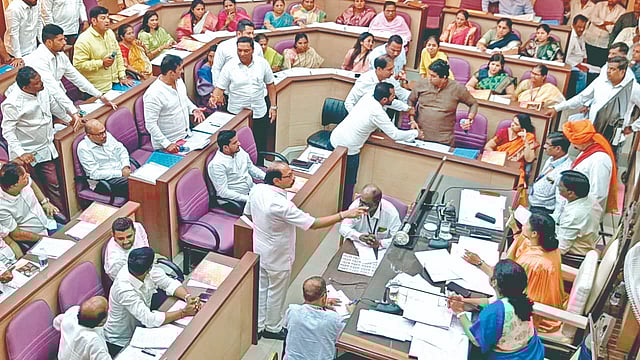 कोल्हापूर ः महापालिका प्रशासनाचा 10 ते 20 टक्के पाणीपट्टी दरवाढीचा प्रस्ताव अखेर आक्रमक नगरसेवकांनी फेटाळला. परंतु, सभागृहात पाणी प्रश्नावरून प्रचंड गोंधळ झाला. महायुतीचे घटकपक्ष शिवसेना गटनेता शारंगधर देशमुख व राष्ट्रवादी गटनेता आदिल फरास यांच्यात तुफान हमरीतुमरी झाली. महापौर रूपाराणी निकम, आयुक्त के. मंजुलक्ष्मी यांच्यासमोरच दोघांनी शड्डू ठोकून एकमेकांना चौकात येण्याचे आव्हान-प्रतिआव्हान देत बघून घेण्याचा इशारा दिला. बुधवारी (दि. 18) महापालिका सभागृहाचा आखाडा होऊन वातावरण प्रचंड तणावपूर्ण बनले होते.