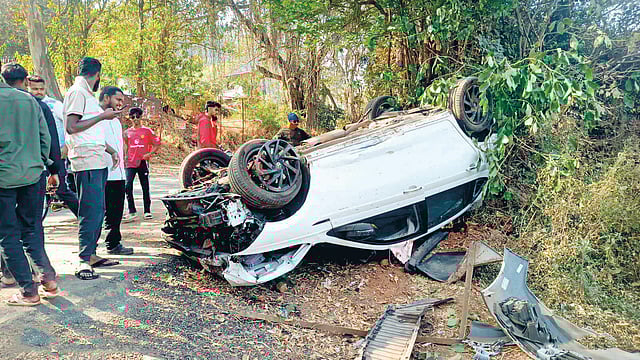 पन्हाळा : कोल्हापूर-पन्हाळा मार्गावर रविवारी पहाटे भरधाव कार थेट बीएसएनएलच्या खांबावर जाऊन धडकून उलटली. यात लोखंडी खांब उखडून 30 फूट फेकला गेला. या अपघातात कारमधील दोन तरुण गंभीर जखमी झाले असून त्यांच्यावर कोल्हापूर येथील खासगी रुग्णालयात उपचार सुरू आहेत.