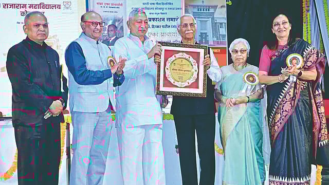 कोल्हापूर : राजाराम महाविद्यालयाच्या वतीने देण्यात येणारा प्रतिष्ठेचा जीवनगौरव पुरस्कार यावर्षी माजी राजारामीयन मेजर जनरल शशिकांत पित्रे व सौ. पित्रे यांना खासदार शाहू महाराज व माजी कुलगुरू डॉ. माणिकराव साळुंखे यांच्या हस्ते प्रदान करण्यात आला.