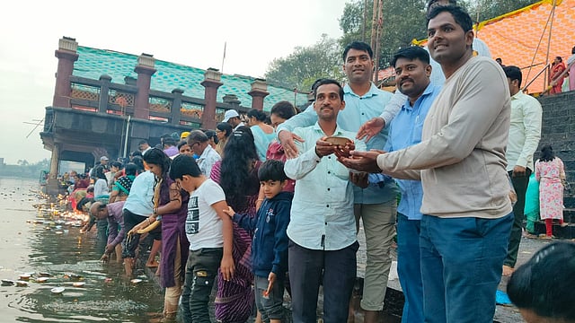 नृसिंहवाडी : नृसिंहवाडी येथील प्रसिद्ध दत्त मंदिराच्या घाटावर त्रिपुरारी पौर्णिमेनिमित्त असंख्य भाविकांनी कृष्णा-पंचगंगा संगमावर पवित्र कार्तिक स्नान करून श्री दत्तांचे दर्शन घेतले. दक्षिण उत्तर घाटावर भाविकांनी हजारो दिवे प्रज्वलित केल्याने इथला परिसर फुलून गेला होता.
