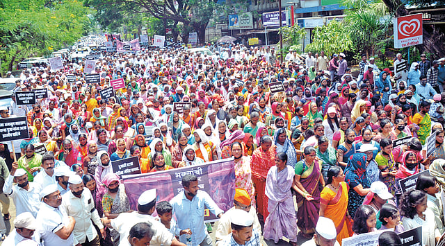 कोल्हापूर : जोतिबा मंदिरावरील पुजार्‍यांना हटवण्याच्या मागणीसाठी परिते ग्रामस्थांनी सोमवारी दसरा चौक ते जिल्हाधिकारी कार्यालय मूक मोर्चा काढला. (सर्व छाया : पप्पू अत्तार)