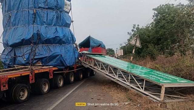 याबाबत अधिक माहिती अशी, गुजरातहून गंगापूर मार्गे कर्नाटककडे कंटेनर (जी. जे. ०१ सी व्ही ५५९९) महाकाय यंत्र घेवून जात होता. भेंडाळा फाटा येथील गंगापूर मार्गावर या कंटेनर चालकाचा वाहनावरील ताबा सुटल्याने कंटेनरची दिशादर्शक कमानीला जोरदार धडक बसली. कंटेनरच्या बाजूने जाणाऱ्या कारवर ही कमान आपटल्याने कारचेही मोठ्या प्रमाणात नुकसान झाले. अपघाताची माहिती मिळताच गंगापूर पोलीस ठाण्याचे पोलिस उपनिरीक्षक प्रमोद काळे, ट्रॅफिक हवालदार संदीप राठोड, श्रीकांत बर्डे, रमेश जारवाल यांनी घटनास्थळी धाव घेतली. त्यांनतर रस्त्यात पडलेली कमान क्रेनच्या सहाय्याने बाजूला करीत पोलिसांनी वाहतूक कोंडी सुरळीत केली.