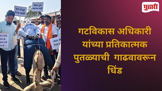 औंढा नागनाथ : प्रधानमंत्री, रमाई, शबरी आवास योजना, महाराष्ट्र ग्रामीण रोजगार हमी योजना विहीर व जनावरांचा गोठा अनुदान तत्काळ मंजूर करून लाभधारकांची मागील थकबाकी त्वरित देण्यासाठी गुरूवारी (दि. 8) औंढा नागनाथ गटविकास अधिकारी यांच्या प्रतीकात्मक पुतळ्याची गाढवावरून मिरवणूक काढण्यात आली.