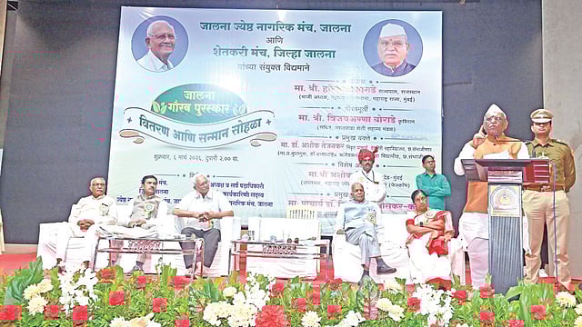 जालना ज्येष्ठ नागरिक मंच, ज्येष्ठ नागरिक महिला मंच आणि शेतकरी मंच जिल्हा जालना यांच्या संयुक्त विद्यमाने कृषिरत्न विजयअण्णा बोराडे यांना राज्यपाल बागडे यांच्या हस्ते ‘जालना गौरव’ पुरस्कार प्रदान करण्यात आला. शुक्रवारी (दि.6) जे.ई.एस. महाविद्यालयाच्या सभागृहात झालेल्या सन्मान सोहळ्यास महाराष्ट्र ज्येष्ठ नागरिक संघटनेचे उपाध्यक्ष अशोक तेरकर, महिला आघाडी अध्यक्ष प्राचार्य डॉ. निर्मलाताई भोसकर- कोरे यांची प्रमुख उपस्थिती होती.