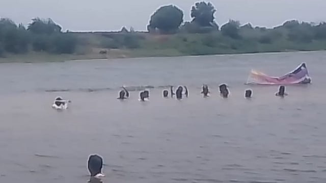 शहागड : अंबड तालुक्यातील गोंदी येथील गोंदेश्वर मंदिरा जवळील गोदावरी नदीत आज (दि. ९) दुपारी १२ वाजता शेतकऱ्यांनी सामूहिक जलसमाधी आंदोलन केले. विविध मागण्यांसाठी ३० शेतकऱ्यांनी नदीच्या मध्यभागी खोल पाण्यात उतरून जलसमाधी आंदोलन करून प्रशासनाचे लक्ष वेधले. यावेळी नदीकाठावर ही मोठ्या संख्येने शेतकरी थांबले होते. त्यांनी प्रशासनाचा निषेध करत घोषणाबाजी केली. प्रशासनाने होडीसह पोलिसांचा मोठा बंदोबस्त तैनात केला होता.