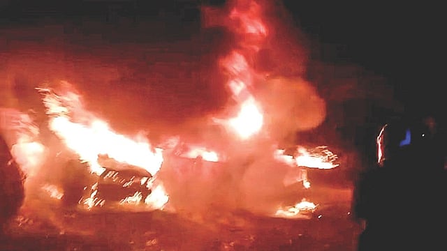 नांदेड ः शहरातील बाफना टी पॉइंटजवळ शनिवारी पाहटेच्या सुमारास एका अरमान डेंटिंग पेंटिंग कारच्या दुकानाला भिषण आग लागली. या आगीत दुकानातील तीन ते चार कार आगीत भस्मसात झाले तर इतर चार ते पाच कारला थोडी झळ पोहंचली. अग्निशमन दलाने वेळीच आग विझवल्याने आग इतरत्र पसरली नाही. आणि मोठे नुकसानही टळले.