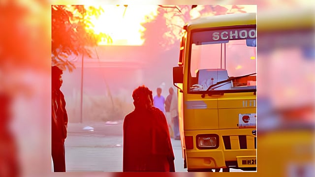 छायाचित्रात रस्त्याच्या कडेवर शाल गुंडाळून उभा असलेला एक व्यक्ती, पार्श्वभूमीला धुक्यात लपलेली शाळेची बस आणि सूर्योदयाची केशरी लाली यामुळे कडाक्याची थंडी स्पष्ट जाणवते. परिसरातल्या लोकांना पहाटे घराबाहेर पडताना मोठ्या प्रमाणात उबदार कपड्यांचा वापर करताना दिसत आहे.