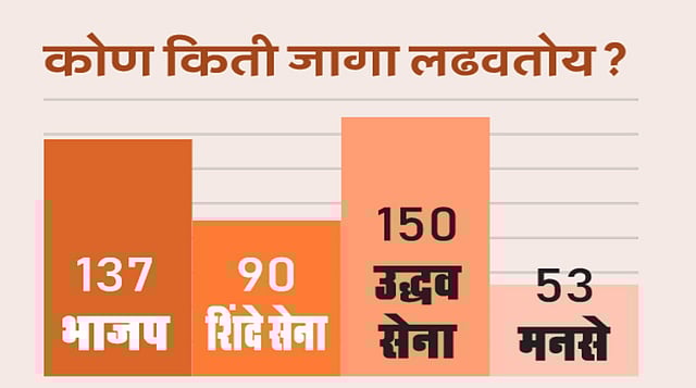 भाजप 137 जागा लढवत असून, शिंदे सेना 90 जागांवर लढत आहे. तर दुसरीकडे उद्धव सेना 150 पेक्षा जास्त जागा लढत असून, मनसेचे 53 जागांवर उमेदवार उभे आहेत. भाजप 137 जागा लढवत असल्याने एकट्या 114 जागा जिंकेल, अशी परिस्थिती नाही. 2017 मध्ये 82 जागा भाजपने जिंकल्या होत्या. त्यात थोडी वाढ होऊ शकेल; पण शिंदे सेनेने 20 पेक्षा जास्त जागा जिंकण्याची गरज आहे. तरच भाजपच्या हाती सत्तेच्या चाव्या येतील. त्यासाठी शिंदे सेनेचे प्रयत्न सुरू आहेत. शिंदे सेना वगळली तर भाजपसाठी दुसरा मित्रपक्ष मुंबईत नाही. अजित पवार यांचा राष्ट्रवादी वेगळा लढत असून, माजी मंत्री नवाब मलिक यांच्याकडे जबाबदारी देण्यात आली आहे.