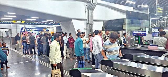मुंबई : रविवारी संध्याकाळी कांदिवली पश्चिम मेट्रो स्थानकावर संध्याकाळी एक मेट्रो बराच वेळ थांबल्याने संपूर्ण मेट्रो मार्गिकेवरील सेवा विस्कळीत झाली. काही मेट्रो स्थानकांमध्ये अर्धा ते पाऊण तास मेट्रो थांबल्याची तक्रार प्रवासी करत होते.