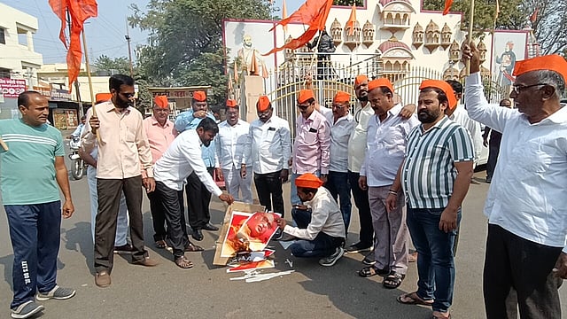धुळे : छत्रपती शिवाजी महाराज यांच्या संदर्भात वादग्रस्त वक्तव्य केल्याप्रकरणी राहुल सोलापूरकर यांच्या प्रतिमेला जोडे मारून गुरूवारी (दि.६) जिल्ह्यातील मराठा समाजाच्या वतीने आंदोलन करण्यात आले. शासनाने त्यांच्यावर तातडीने कठोर कारवाई करावी, अशी मागणी यावेळी करण्यात आली. धुळे शहरातील महाराणा प्रताप चौकात हे आंदोलन करण्यात आले.