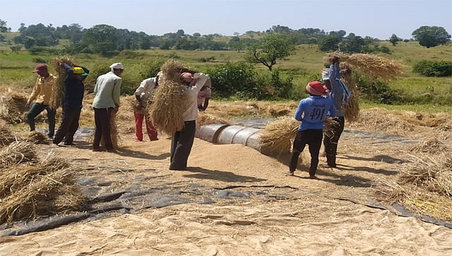 देवगाव : भातशेती कापणी व झोडणी करताना शेतकरी वर्ग. (छाया: तुकाराम रोकडे)